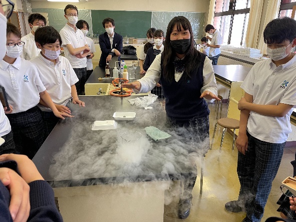探究学習部アクティブラーニング部門は、部員たちが主体となって興味のある実験や探究したい内容を考えて行う部活です。週に一回の活動で、他の部と掛け持ちしやすいのが特徴です。学園祭では、液体窒素など普段の活動では使えないようなものを使って演示実験を行います。